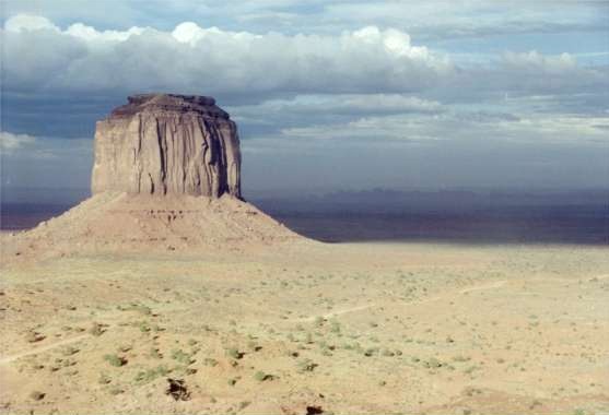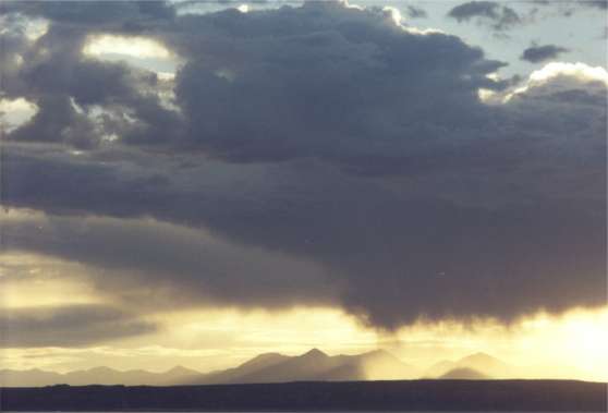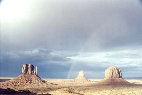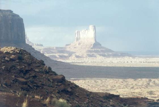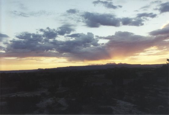 Friday 6/30/00 What’s it like to wake up in "the realm of the gods"? No different from others. But it’s great to be able to enjoy it. Things like a man made campground and general clutter fade into unimportance. I am struck by a people, local Navajo, who continue to struggle for existence in the awesome presence of such surroundings. It’s a puzzlement that culture alone would seem inadequate to explain. What have we other Americans done and continue with that contributes to such poverty? Perhaps in the end it is style rather than substance. This environment could never support more than subsistence. "American basics" such as running water and electricity are still luxuries here. Native culture, greatly impacted by ours, has been forced to reflect an existence less in tune with the land than their ancestors, thus a poverty impression. If with sheer will, Native Americans remain here with their ancestors, religion, culture and effort to honor the land, it will take creative genius to advance, in our terminology without loosing their roots. With an American culture that has difficulty honoring even the present, perhaps helping to engage creative genius is where we currently fail if we have an obligation to peoples we’ve displaced. This morning has a cool breeze, almost chilly. Today’s "job" is to explore the valley and figure out where to sleep tonight. Sunrise was super as was last night's sunset in spite of, or perhaps because of general heavy cloud cover. 10:30AM at a valley viewpoint The day’s doings: One more sunset and sunrise here is assured through reserved campsite 24. After 3 hours at one location looking back across the valley’s monoliths toward the visitors’ center, it’s hang out at site 24 from 2PM until after sunrise tomorrow. It may seem a strange day but watching an everchanging landscape-painting, courtesy of clouds and shadows highlighted by changing sunlight angle, is one reason for vacations. Beach lovers would agree.
