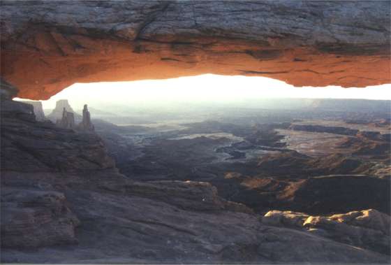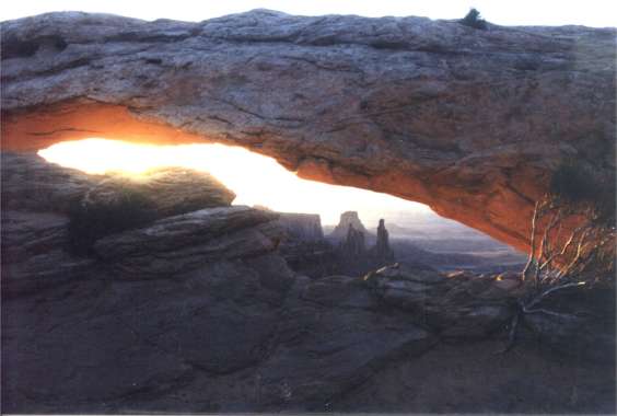 The park, late June, is far less trafficked than Arches NP. It is also cooler sleeping out. There are lots of evening bugs that disappear in the night air. Expect no facilities or water, just a small campsite, picnic table and covered pit toilet. 6 Canyonlands NP - Needles section Wednesday 7/28/00 After sunrise at Mesa Arch in the Islands section of Canyonlands NP, this time with a camera in hand, headed for Canyonlands Needles section 110 miles drive away. Arrived at the Chester Park loop / Joint Trail and Elephant Hill trailhead at 12:45PM for an 11 mile hike. After a stop in Moab for lettuce, tomato and block ice, a small breakfast and no lunch this was decidedly a two bar hike. That’s two Cliff chocolate chip energy bar hike. It’s not what the name implies. Instead, the ingredients are what your mother wishes you’d eat. They are not sweet, taste good (when hiking) and get the job done. This was a tough haul more for distance and heat considering it’s far from level. If you’re drinking water it’s likely not enough. You need to push it down constantly. Of the two Canyonlands sections, my choice is Needles, no contest a much more inviting physical environment full of its own preference of basic colors. You could do just the 6-mile Chester Park Viewpoint hike that doubles back over its route. Both trails retrace this section. Chester Park Viewpoint has most of what the joined trails have minus some interesting cool and narrow walks between mega blocks of stone. Do not start either hike if not in reasonable condition. Absolutely do not continue on the Joint Trail if you're not feeling great. The extra 5 miles will be unpleasant. 70 ounces of water was consumed after having tanked up ½ hour before starting. It was still good to have a reserve bottle if needed. The last 3 miles were water force-fed. Met a man shaded by a Pinion Ponderosa pine tree at the Joint Trail crossroad who considered himself a fast hiker. We couldn’t compare times because our start points were different. He felt the Park Service times were short. Two women, hikers in the flesh, didn’t. Eleven miles accomplished in 4 hours 45 minutes left little to consider an additional footstep. Agreed, Park Service time of 5 hours + is short or assumes hard-core dessert hikers. Having been at the gym and mountain biking for months I’m likely properly cooked. I’ll find out if I hike with Curt during the Grand Canyon trip. You know, the one stride for my two, body in mediocre shape, leave me in the dust going up hills trip organizer. Thursday 6/29/00 Up again at 5:30AM for sunrise opportunities after several nighttime wakeups perhaps due to one circling buzzard (mosquito) that couldn’t quite be echo located for subsequent execution. Did the best possible photo op with some cloud cover sunward. Now that it’s over, guess it’s time to get into photography enough to at least clean a very dirty lens and polarizing filter. It might also help in using some of my photo technique knowledge if I reacquaint myself with how to take the various camera functions off "auto". Time to read the manual of a rarely used camera. Been sitting in a closed car to keep out the bugs at a roadside get-out-of-the-way spot chosen for pictures while making notes as the sun rises further. It’s getting warm in here, time for the scenic drive before returning to camp for clean up and making plans. Definitely no long hikes today. The question is weather to move on or stay. This sure is pretty in the changing light and cloud shadows. With very little roadway and only a couple of roadside viewing points plus some well chosen roadside get-out-of-the-ways, this is a place to choose your hang out spot or hike. Enjoy the drive to and out of Canyonlands NP, specially the Needles section. It rivals the Park. Glenn driving 10 mph below the 55 mph speed limit should give an indication. It feels like a mistake leaving after one day but hike or leave persists at a time when not hiking today is likely best. Departing pesky bugs, needing a day off from hiking and the beckoning of Monument Valley at sunset as well as sunrise is a strong incentive for road miles. The car is in motion. Michael Jackson’s Thriller makes a great counterpoint to these hills. It starts with wind and a creaking door. Just outside the park, during this trip with no large animal sightings, it’s joyous to see the second coyote trotting across the Needles access road. 7 Canyonlands NP - Needles section General Impressions