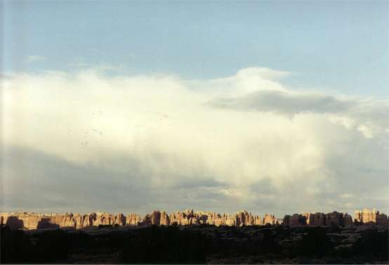 Monday 6/26/00 A marginal few raindrops to suggest closing car top and windows produced urgent stirrings just short of morning twilight. Guess it’s time to drive to Canyonlands NP, Island in the Sky section to insure a campsite. They are filled by 10AM per Arches NP rangers. Most unexpected, the Honda was just visited by a hummingbird while waiting for the opening of the Canyonlands visitors center. The hummingbird checked out all the Honda’s windows in this scrub-growth dessert environment. Ok, so there’s a pair of small rabbits as well. Plus there’s the lunacy of a chipmunk. 9:08AM at Syncline loop trailhead is a two-car space staging area with picnic facilities and more parking just behind. The gods must be with me, it’s a late trail start if beating mid day heat is a priority, but it’s overcast and cool enough for an 8-mile jaunt. The big question is taking raingear. Didn’t plan for this. Unpacking the Thule car-top carrier to get at squeezed in Grand Canyon gear isn’t on the touring list. It’s cool out and getting cold easily is a byproduct of body build. Heads says take a chance and go without raingear even if it seems daunting. Tails wins without the coin toss. Too much of a coward to face perhaps two hours rain-soaked on a cool day. Opted to carry the sunscreen just in case. It’s dripping the same rain, insufficient to get you wet, that was morning’s wakeup stimulus. Stepping out of the car, the first real rain arrives as more than just a sprinkle. A solution to indecision is; switch to hiking boots in case it gets slick and use a a collapsible tote umbrella. Don’t laugh. It will work. 9:30AM the hike ensues. Having arrived this morning at the visitors’ center an hour before the rangers is likely the cause for what follows. He, the ranger, definitely said crater. Succinctly came 8-mile loop trail. Being willing, the likely conclusion is a moderate hike of this distance around the rim. Hopefully the ranger was doing his job well and had sized me up first glance for an athletic young buck, full of youthful energy (at age 55). Being a self-perceived non-hiker, no mention of implied difficulty had been generated; none discussed. As a loop trail your choices are clockwise or the other way. The arbitrary decision was clockwise. As the trail made a gentle case suggesting a descent, thoughts of "up first is preferable to down first" ended quickly. An eighth of a mile in produced more wind and rain than a tee shirt, shorts and umbrella was comfortable with. Plan B to do the 2 mile round trip to an overlook evolved quickly. At a quarter mile, still on a negligible descent, the rain and wind abated. Ahead, now in view, the reason for the hike took shape. High canyon walls across a wide chasm, typical for the area, precipitated questions self answered. No way they would direct the trail over there. Correct, the trail is not crossing this deep gorge but it can descent into it. The descent starts now. Still puzzling out a moderate rim hike it was obvious the steep descent couldn’t last. Thirteen hundred basically vertical feet with only a couple of minor boulder scrambles does not constitute a rim hike. All the way down it seemed unlikely the trail would go the distance. The climb out will be unpleasant. At 3.5 miles in, having walked a long time on a gradually descending wash, a park service signpost provided the bad news. There were 3 miles to a dead end that way and 4.8 miles to go on my chosen path. Should have looked up syncline before starting (syncline trail). ("A fold in rocks in which rock layers dip inward from both sides toward the axis.") The Syncline trail now gradually ascends from the confluence of two washes that combine for that 3-mile dead end run toward the Green River (6-miles round trip). Up the wash not yet traveled, umbrella rolled up in one hand, the pace quickens. This is going to be a long day. Hope this direction is a steep descent and gradual ascent out. A 30-foot high dry-wash pour over is evidence of where many have been fooled before. The trail seems to go in a circle up a steep hill and down into the wash just short of the pour over. There has to be a way up and over it. Having picked up a set of one-direction footprints clearly delineated in flattened post rain-wash surfaces; it was clear the creator had continued forward. Yet the kerns seemed to circle. A sudden change in direction to a vertical rock scramble up 20 feet from the highpoint of the former circling trail could be easily overlooked. Atop the pour over and traversing flat again the logic was continue up the wash. But the trail seemed headed out of the wash toward an alternate very steep high climbing notch. How are they going to get us out of there? Some ups and shallow downs bearing toward the notch revealed a promising opening to the right. This opening was not to be, the notch and up was. Much vertical trail mixed with boulder scrambling, then the view back became impressive for what had just been accomplished. There were a few fear-of-heights moments for those inclined that could be dispatched by concentration on continuous movement forward. Suppose the ranger had been wrong about "the athletic young buck". Some of this trail’s offerings would be hard on a general hiker and difficult during a sunny day, perhaps dangerous if short on water or energy bars. Yes it gets you up close and personal with the terrain but unless you’re in for the exercise stick to the scenery easily acquired. This was one tough hike. The positives were taking the clockwise direction for the 1,300-foot climb. The weather was god sent. The 7-mile Arches NP Devils Garden push, a beginner’s trail next to this, was just enough stress on tendons and ligaments behind a non-hikers knee to add the resilience needed here. The pounding of a long descent, the aerobics and muscle needed for the ascent, the normal heat would be painful at best for an intermediate hiking body. Plenty of accessible water