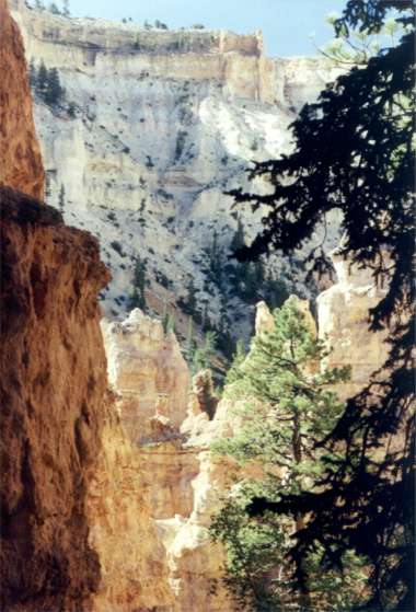 It’s a small place among low growth trees in an arid climate. The view of 3 stone bridges from overhead viewpoints is little more than a yawn. The more spectacular perspective of these natural stone bridges is from their bases. It would be better to visit only one bridge from the level of the river that carved them and spend some relaxing time along the riverbed than to scurry by at the driveway level. You could get some quality quiet time if only for an hour or two. You could also hike to all 3. But leave yourself more than half a day as I did. Saturday 7/1/00 mid afternoon Beside Lake Powel at a two-car length pullover with the lake down an unobvious 20-foot incline, there’s a very warm breeze drying my hiking cloths. I would have let it dry me as well but modesty is best back at the car. Washing salt sweat and sunscreen off always feels good. Had to veer from my original planned route across 68–mile Burr Trail, an unimproved road. The rangers at Natural Bridges advised against it in a standard clearance car. AAA states my current drive along highway 95 and 24 is a scenic one. Agreed thus far. The colors of the rainbow would be hard pressed to outnumber the various changes in terrain traveling 95 and 24. Jagged mountains, flattop mesas, differing forms of rock and many types of sandstone, they are all about. Tonight’s "campsite" is courtesy of a ranger at Natural Bridges. According to him, there are many places in Dixie National Forrest to just pull in and set up for the night. It’s only 7:45 PM in the middle of a jeep or wagon trail that sees rare use. If lights show up tonight the Honda will have to be moved. There’s no driving around it. Among the smell of a Ponderosa pine forest somewhere high up is a break in the trees that oversees a new trip’s-environment and another amazing view. Below are scrub-growth covered mesas. In the distance it looks like barren pail sandstone. Beyond that is too hazy to make out, but the view when clear must go a very long way. Being prepared for self-sufficiency allowed for this happenstance stop. The sun is setting behind the mountain underfoot whose summit may not be much higher (Boulder Mountain). Hope this means sunrise is somewhere ahead. Think I’ll set up the car for tonight and take a short stroll down this trail before the light fades. The trail belongs to no one. It passes through beautiful white Aspen and Ponderosa pine woods then fades into the forest 1/8th to ¼ mile behind the Honda, which faces a backup-turn switchback toward the highway. At one time this trail went ahead as well. Following it a short distance takes you to a location overlooking a noisy campground 400 feet below. Though very short, these have been the first cool temperature walks so far. It may get cold up here tonight. Far off in the distance, too far for sound, is a lightning storm. Good day’s end. Sunday 7/2/00 With eyes available minutes before the sun’s bright orange face, it’s a get up comfortably chilly morning. A few thin scattered clouds and a 5 to 10 mph constant breeze outside the Honda make a slow impetus for morning wash-up, teeth and shave. With temperature and breeze combining for slightly numb wet fingers and face, shaving is a careful pursuit. Perhaps it’s the ever-rising sun or the eminent car’s shelter, but one windbreaker fleece vest has done it. For the record, it was a two fleece blanket night, though according to the North Star, the sun rose NE. Should be at Bryce Canyon an hour before they open the visitors’ center. Dixie Forest’s Boulder Mountain has some overlooks worth a stop but they are afternoon and evening sights. If you’re driving Dixie’s route 12 at night, beware; this is open range country. A steer or deer may adorn your hood. They are both plentiful enough to be a risk. Distance miscalculation: It will be an hour or two after opening at Bryce. Blew through Capitol Reef NP yesterday late. The visitors’ center was closed so there’s no information. It looked like hiking mesas country. Now, just short of Escalante, NM within Grand Staircase, NM has brought a 70 mph attempted pass-through back to reality and a pause in the morning light. Barron, slightly gray, cream colored massive solid rock hilltops are pockmarked with tufts of tiny trees. From this elevation it is an expansive view (Hogback-narrow ridge – 1940 automotive mail service route to Boulder). The plaque says, "As you drive over the narrow ridge of the Hogback, it is easy to imagine that you are walking a circus high wire." They got that right. Any wrong turns here are downers on either side of the road. Don’t barrel into any of the abbreviated gravel pullovers. It could be your last act in life. Thankfully the short 8-foot wide rental RV changed its mind about pulling in behind me. Thank you, thank you, and thank you! He picked the next pullover 40 feet ahead and left some of the vehicle still in the roadway. He could have pulled all the way over with his wife in cardiac arrest. This is the direction to be headed on this road since it has the pull-offs. A plaque further along route 12 reads "On a clear day you can see forever." Even in some haze, Boulder Mountain now 30 straight-line miles away, looks to be just over there. "Boulder Mountain sits atop Aquarius Plateau. It is the highest timbered plateau in North America, with elevations exceeding 11,000-feet above sea level." Further down the road, Escalante appears to be an entire small town in the process of a major face-lift. It may become a fun tourist stop. The last miles into Bryce begin with sandstone that’s almost peach color and looks like an effort to create a castle by dripping sand on sand at the beach.