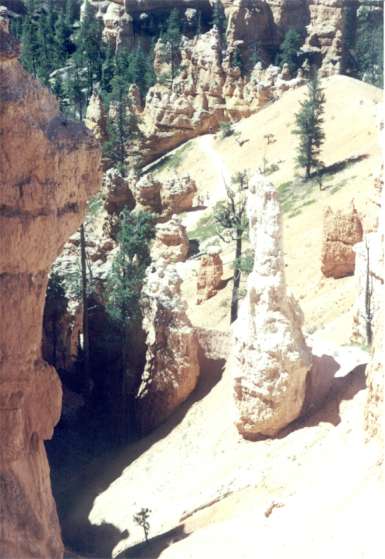 Hiked all day; Navajo trail to Peek-a-boo to Queens Garden to Sunrise Point and back to North Campground was the morning run. After lunch, hiked the Rim to Fairyland Point to Tower Bridge, back to Sunrise Point and North Campground. Add in miscellaneous and the total ground covered today was 15-miles. This is not recommended if you’re not feeling strong. Lots of ups and downs await. Keep your water battery charged; you’re at 8,000 feet. Wear sunscreen, the light is intense. Tuesday’s plan is up early for sunrise photos then hit the road. The easy, short rim hike yesterday with ranger at 5 PM was informative even though played down for the younger set. The 9 PM ranger hijinks slide show adjacent the campground was likewise. I’m whipped from today’s excursion but not so much to miss a shower and laundry. It’s windy. Perhaps campers will quiet down early. Tuesday 7/4/00