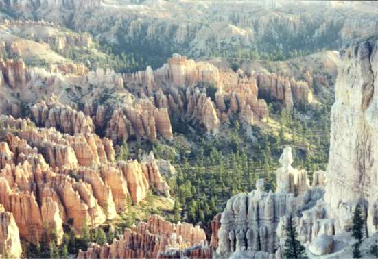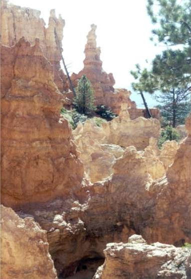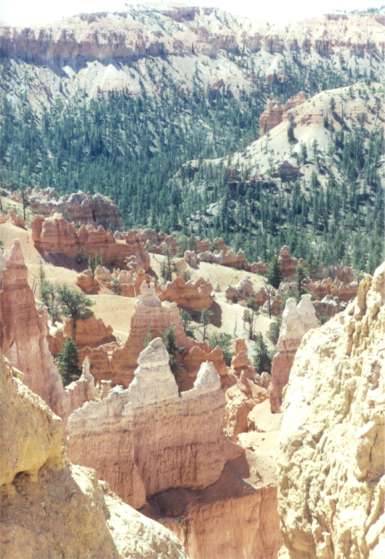 Bryce – first impressions: This park has organization disaster written all over it. Before you get to the visitors’ center you have the park’s shuttle bus service with a parking lot arrangement that makes every car consume gas via the longest exit route available. This stop is also useless if you intend to camp in the park since you must drive in, to get to the campgrounds. Parking is so limited at the visitors’ center that musical cars are the rigor. More polluting fuel is in the air. Shuttle busses, begun 3 days ago, are frequent but diesel? Campground entry is total confusion. Pick a number and register before you enter or drive in confused by loop A, B, C, D each intended for a type of use (vehicles over 20-feet, short vehicles and no generators). So you drive in to find your site and get lost trying to figure out how to get back to the registration board. Hasn’t the parks service figured out yet a picture is worth a thousand words? Haven’t they learned to put simple, obvious signs at junctures? On the other hand, Bryce has monstrously beautiful and inviting colors both subtle and bold in a complex repetition of forms and patterns interesting to the eye. Ok, the warning’s been given. It could get down to 40+ degrees tonight. Think it’s time to pull out every warm thing in the car. May need something for the 9 PM ranger talk. Crud, it’s unpack the Thule. Inside is the only windbreaker. Monday 7/3/00