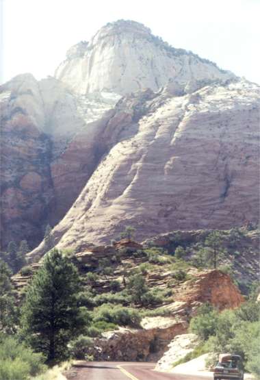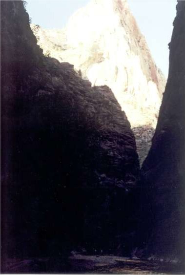 Cedar Break National Monument is a very small less complex version of Bryce. With limited hiking, it is colder, windier and approximately 2,000 feet higher at 10,000 feet plus. It’s a late get up place with light coming over your shoulder to arrive in the canyon around 9 AM. It’s 48 degrees and windy. Perhaps from the sun at almost two miles above sea level, the cold in this wind is not intense. There are no crowds here. The light here at 9:30 AM is so crystal clear it makes everything seem more defined. The descent of route 14 to Cedar City is an ear popping 4 to 5,000 feet. Gear down or have good breaks. July 4th, courtesy of Cedar City at 10 AM, route 14 is dead stop until they Finnish with their parade. Tuesday 7/4/00 Zion NP I-15 exit 40 to Zion’s Kolob Canyon is at the northern end of the park with no roads connecting to the rest of Zion. The drive in for viewpoints is short. Camping at the southern end may be hard to find tonight per the ranger at this visitors’ center. At the southern end of the park many miles from the Kolob entrance, Zion, from a roadside viewpoint by car or shuttle bus is a canyon cut by the Virgin River. It’s a place of impressively massive vertical sandstone mountains and cliffs in two main colors, rust and gray beige. Impressive as in cliffs 2,500 to 3,000 feet are climbed in two days. Think of a 125 to 150-story industrial building. Of course there aren’t any today. It’s impressive, even domineering if you find a summer-shaded scene. Impressive, a geologist’s and climber’s treat. Yet it seems not to inspire. Perhaps its beauty is subtle and elusive. It brings to mind the phrase, "How are you going to keep them down on the farm once they’ve seen Paris". These cliff walls are no match for the high cliffs of the Grand Canyon seen from the river. They lack the size breadth and complexity. Morning and evening here bring the glow of reflected light. "Having an off day?" you may be wondering. There have been a few stumbles, but what would pick up a paddler’s day? Take the shuttle, which follows a canyon cut by an "R" word, a gentle gravel and river-rock flow when not in flash flood. A mile and a half up a tree shaded, easy walking paved path and it’s river sandals time. Many do it. Few have the equipment. 300 yards up and you’ll get your shorts in water as the canyon closes in. The Narrows may be tomorrow’s challenge attired more properly in synthetics. There may be some other short look-see jaunts as well. A ranger said you have to take some long hikes to get to the good stuff. You would need inspiration for a 2,100-foot elevation change 8-hour hike even if you were likely to do it in less time. The 3,000-foot hike up from the Tatshenshini River, Yukon, Canada was worth it. The lofty views available here are already in the mind. Putting the energy for this one in the bank for the back side (other than straight vertical side) of El Capitan some day seems a good compromise. If you bring a bike, you can stop where you want along the shuttle bus route and if pressed for time, might even outrun the bus. Cyclists have passed in the opposite direction on occasion. Their freedom is likely the next best thing to a hike for getting to know the place. Wednesday 7/5/00