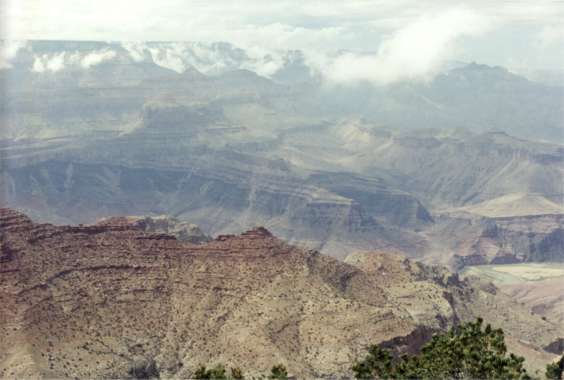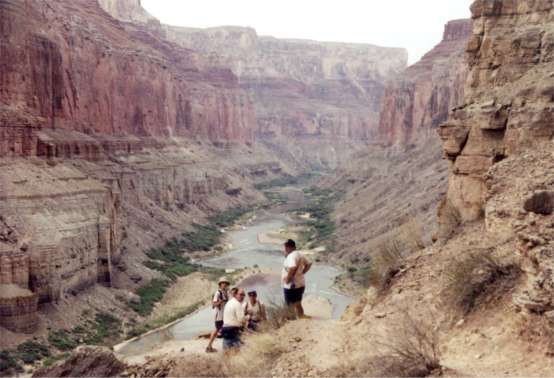 Saturday 7/15/00 – 5th day The day started off overcast and warm. We’ve faced wind and large wave rapids that would be considered serious in the east yet are primarily scouted on the more here. We swam in the crystal clear blue waters of the Little Colorado River. During the trip 11 years ago it was so thick with mud the froth usually associated with river currents careening over ledges and boulders was unable to form. We are camped within site of the South Rim tower of the Grand Canyon’s Southern Rim. This is one of the few places you can see the river from the rim. Of course the distance is so great, people on the rim are unable to see us without a telescope or binoculars. They would also have to be looking for our specks along the river shoreline. The morning of the eighth day is quiet. No loud or even moderate background sound of rushing water. No rapid or riffles to moderate sound from early risers' movements. No early risers either. A mere zephyr breathes through wisps of thin green Tamarack leaves. One boulder just under the water’s surface turns the current into a low oscillating frequency punctuated by quiet splashes. It’s a simple reminder of power and speed. Into the future, perhaps a half-mile away, is a drone from something to come. At full dawn’s cloudless blue-gray sky, a golden patch from sunlight grows on the far inner canyon wall. It must be fairly late, yet few have stirred, perhaps a tribute to yesterday's late adventure. River guide maps do not recommend running Horn Rapid at a water level of 8,000 cubic feet per second. We have run some difficult rapids; this one stopped us. It was a test in river running safety. The process of working out a plan and executing it took perhaps 1-½ hours. We had to get a diverse range of crafts, equipment, people and skills past this obstacle. The challenge at the end of a long day of rapids and aggravated by strong winds could lead to mistakes with serious consequences. Linda at the helm performing some kayak ballet weathered the flow with grace. The destiny of each of our remaining crafts was formed through much study of the rapid by those most experienced in our group. Walking, though not an easy task across a boulder-strewn shoreline was the preference of most hard boaters. What remained was one paddle raft and two ore rigs. The constriction we face has an old history. We’ve enjoyed an incredible day. The canyon has changed character due to an uplifted plateau. The Colorado has cut through the uplift to gain access to the Vishnu group; a granite structure so old and hard the river was unable to cut a wide swath. Lacking the power to continue the wide upriver channel, it cut straight down. This magnificent 1.7 billion year old rock, pressed and squeezed, is polished by sand and silt powered by the river. In places it’s cut into smooth freeform shapes undulated like leftovers from thousands of rivulet trails carved vertically into the cliff face. Everywhere your eyes follow upward toward the sky. Punctuated with spires, this rock wall emerges with the complexity of a gothic cathedral, yet these spires dwarf any human creation a hundred times. Our problem in the middle of this amazing place is a constriction that creates river speed that leaves scant seconds for maneuvering. The left side has just enough boulders to make its one apparent channel chancy. River center contains an easy, swift tongue of current that leads to two or three curling waves of serious proportions followed by a final hole that could upset even the weight of the ore rigged rafts, gear and all. River right’s current careens into the same hole. River extreme right: is it passable? The last resort is dismantling for a carry, not a friendly option. The paddle raft is unpacked. The gear is carried. The raft, awkward and heavy is lined along extreme river right from eddy to eddy. At a point when rock and current would combine to rip it from our hands it’s lifted, dragged and hauled across a difficult boulder field. The ore rig’s options are total dismantling or run extreme right eddies and currents over boulders then through a perceived opening between a massive boulder along the shore and the hole of most concern. It’s just wide enough to prevent entering the hole dead on, an uneasy move at best. Rocky wants to go for it. We agree. In a tense moment the raft spun 360 degrees twice. After a near miss of the massive boulder jutting out from river right he was passed the hole and into a heavyweight float trip. Now it was John’s turn in ore rig two. With John aboard we lined this massive weight, eddy to eddy. Could we keep control long enough to get it aligned for the run or would it overpower us and enter harms way? The rope strained from the tug-of-war between the rafts inevitable downriver course and the resistance of a dead stop pull created by friction around boulders. An upstream rope would be released and a second rope set just below, we hoped would hold. On the third rope exchange the sound of a one-ton boulder in motion ensued, then was over before anyone could be shaken by the event. The boulder, intended as the new hold position, took up a new place six inches removed as a 3,000-pound test line went taught under the raft’s accelerating weight. Our next hold position was even shorter as the rope slipped its rock. John was on his own. One hundred people would not have stopped a ton in the grip of a moderate, then accelerating current. A twist, a hard bump against the rock face on river right and the raft slipped by the hole. All that remained now was Curt and myself. The latter, aware of missing a fun eddy tucked between two seven foot waves earlier in the day, opted for walking a quarter of the rapid on river left. A barely successful canoe roll earlier would become unkindness in this rapid. Curt’s run would accelerate him to surprising speed. It was down the chute center right, just catching a hole’s eddy to the left in a still