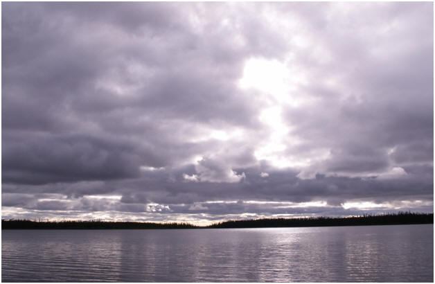 The largest lake of the trip by far can be seen on a road map. It’s roughly in the shape of a U or perhaps a Y. The lake’s obstacle is distance which can be somewhat averted via portage overland across the peninsula that is formed between the arms of the "U". A portage averts a paddle of over 20 miles by a one way hiking distance of 2,200 meters; slightly over a mile. Of course with gear, two round trips are needed at minimum. Over 20 miles of potentially huge lake-wind; instead 2 miles carrying weight with 1 return mile hike seemed the better choice. We started out with almost all the gear. Curt, who has been in the wilderness so many times he’s developed a third sense about many aspects, determined before we started that there was likely a better overland route than that provided on the topographic map's sketchy information from his Canadian source. This could easily be true, since portage trails this deep in the wild are only vaguely marked on maps and the actual ground routes can be so faint they are undetectable for stretches or permanently lost. We were off. My pack weight was approximately 75 to 80% of my body weight in anticipation of a slow pace for little over a mile and a desire to make only one return trip for just canoes. Curt carried two packs; one on his back and one across his chest. The pack's weight, unfortunately for me, was the easy part. Curt took it in stride. Consider a terrain damp enough to cause condensation every evening on the under side of a tent rain-fly before anyone entered the tent. Add uneven footsteps for each knee bend. Then step on sphagnum moss, a sponge like surface many layers deep to the tune of 6 to 12-inches. It makes every step an effort as resistance wears out muscles and requires high steps that quickly builds fatigue. It’s difficult walking without a pack. It makes one think of Mount Everest struggles when hiking through this stuff while seriously overloaded with weight. We were well into the distance when we decided the trail was not bearing off in the right direction. Now we had to bushwhack, no trail to follow toward the hidden far shore. It was no worse hiking, but it did hold an added danger. The sun became hidden behind an overcast sky. Now we had no reference to keep us on course. Without a reference or trail to follow it’s easy to get turned around. Considering I could only hike 30 feet without stopping to lean on my paddle turned-walking-stick, and only 300 feet without having to take the pack off; getting turned around was doubly serious. Without a reference we could wonder off into oblivion; get permanently lost followed by death. We found ourselves approaching an immense open area we had been in before. We had turned around 180 degrees. Luckily I had packed a compass. As long as we followed a relatively straight course in the direction we knew the opposite shore would be, we’d get there, and then use the shoreline toward our intended destination. I pulled the compass out and corrected the declination for the Rupert’s Bay area. We set forth again; Curt with compass leading and me struggling behind. At the first suggestion of approaching twilight, we looked for any possible space to put up a tent. There were just enough bushes etc. to turn finding suitable ground into a challenge. Sleeping on this wet surface unprotected would be hazardous at best. We had been hiking half a day to cover an intended mile-plus distance and had no idea how much further we had to go. It’s just as well we lacked the cook set. Lighting a fire wasn’t likely and with soft moss there was no surface adequate to support the emergence backpack stove. An unconsumed lunch was good for dinner. With the tent up and some night rain, the next thought was daylight.
