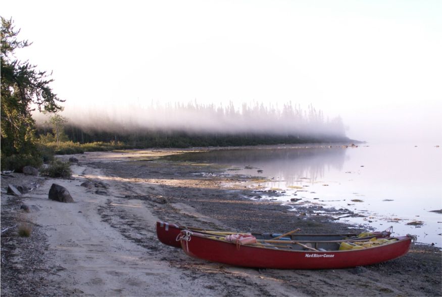 Rounding the point of land, our target for well over an hour, brought the next possible mist shrouded target into view. How long to the rest of our gear isn’t as important as remaining daylight. It’s taken two and a half days to cover the last 20 plus miles of lake and we have many more to go one stroke at a time.